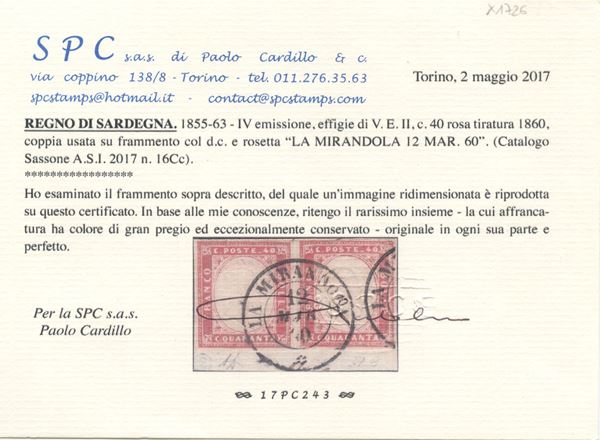 1860 - 40 cent. Rosa n.16Cc in coppia usata con l'annullo a doppio cerchio La Mirandola e conservata su piccolo frammento. Insieme raro. (A) (Alberto Diena, Cert. Cardillo)