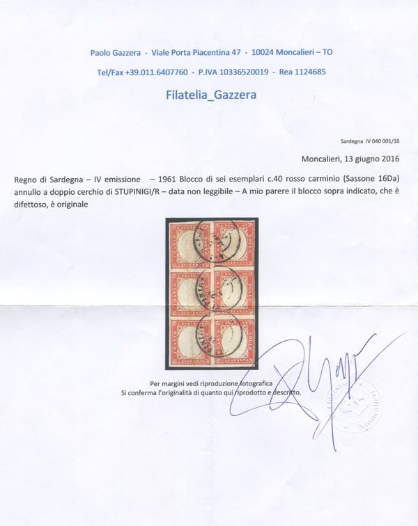 1861 - 40 cent. rosso carminio n.16Da in blocco di 6 usato a Stupinigi (12pt.). Insieme molto raro con alcuni difetti. (B) (Attestato P.Gazzera)