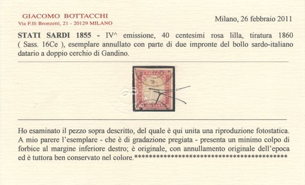 1860, 40 cent. rosa lilla n.16Ce annullato tramite il doppio cerchio di Gandino. Di ottimo aspetto e tonalità perfettamente conservata (A-) (Cert. Bottacchi)