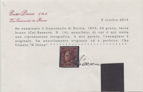 1859 - 50gr. n.14 usato. Tonalità di colore estremamente interessante. (A+) (cert. R. Diena)