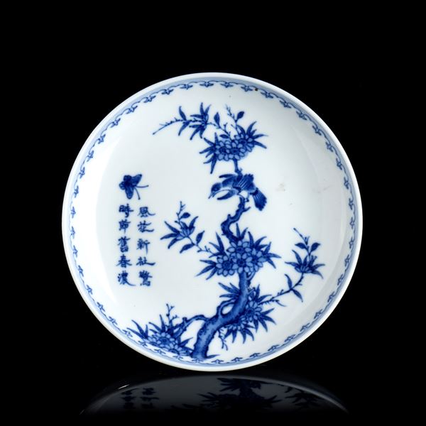 The upper side with a composition with a flowering branch, a bird, a butterfly and a poetic composition; apocryphal Qianlong mark inside the stem.