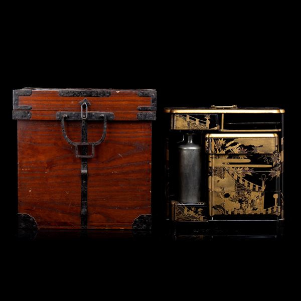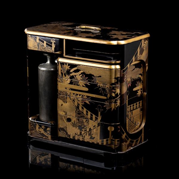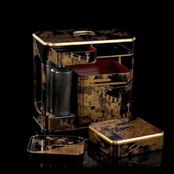 The container has four compartments with lids, a tray, two other compartments and two metal bottles, both signed on the base, the fine decoration made with various maki-e ("sprinkled gold") techniques consisting of figures of bugaku dancers, curtains and landscape elements; It has its wood container with metal fittings.