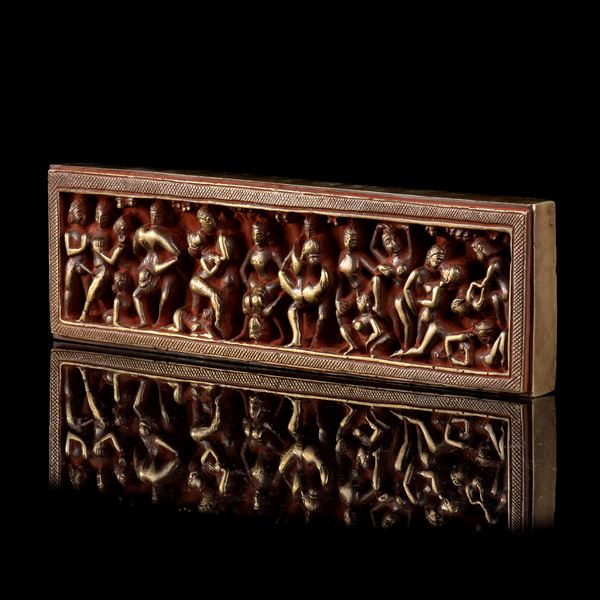 A LACQUERED METAL PLAQUE WITH EROTIC SCENES