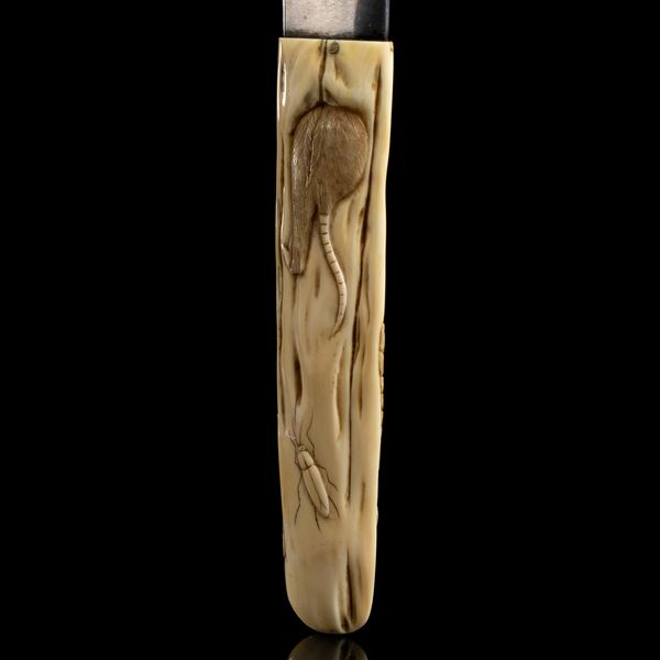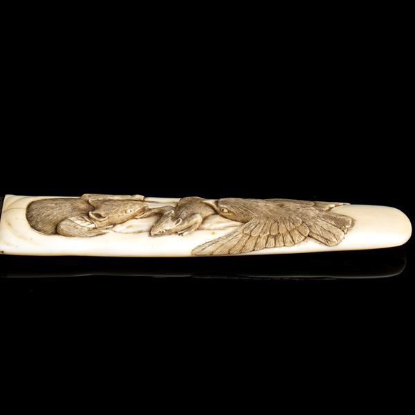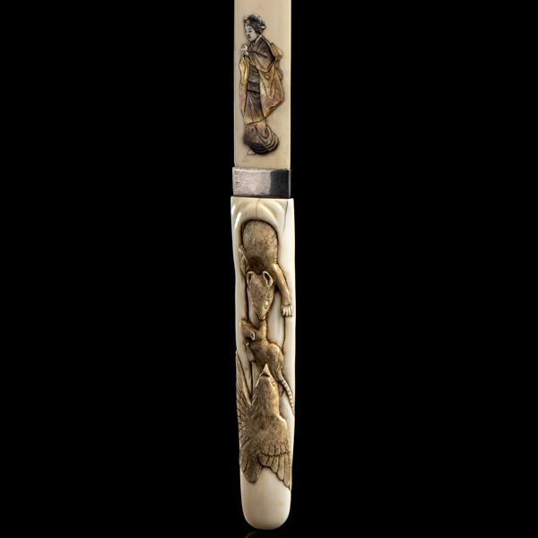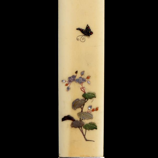 A MOTHER-OF-PEARL AND OTHER MATERIALS INLAID IVORY 'SHIBAYAMA' PAPER KNIFE