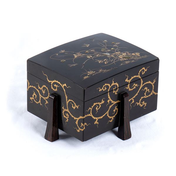 A PARTIALLY GILT AND MOTHER-OF-PEARL AND HARDSTONES INLAID LACQUERED WOOD BOX