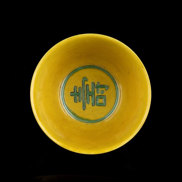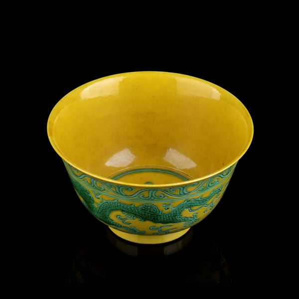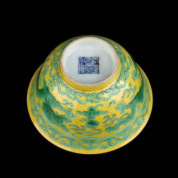 A SMALL GREEN AND YELLOW ENAMELLED PORCELAIN 'DRAGON' BOWL