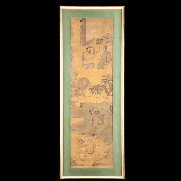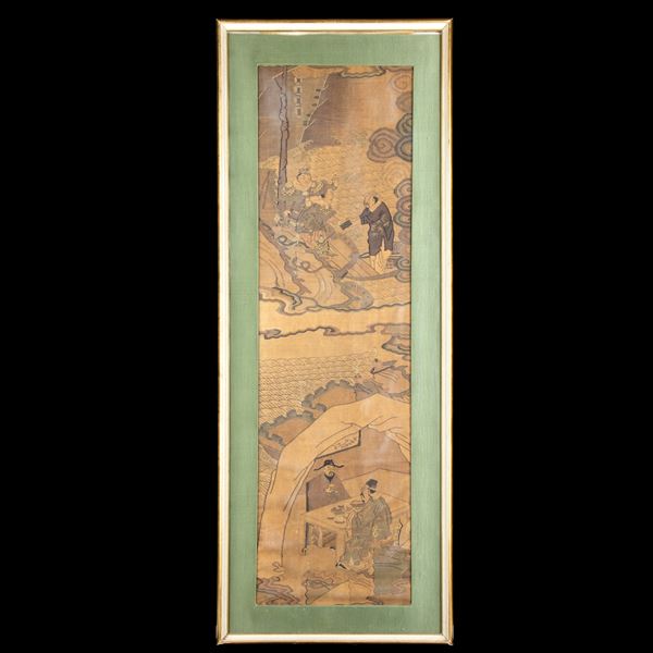 TWO KESI SILK PANELS WITH COMPOSITIONS OF FIGURES IN THE LANDSCAPE