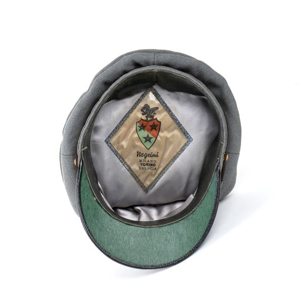 Gray gabardin cap with the typical shape of the war period, beautiful embroidered ibadge with the metallic number 4 indicating the 4th Bersaglieri Rgt, who fought in the Second World War in the campaigns of France and Yugoslavia, manufacturer's marks inside, excellent condition