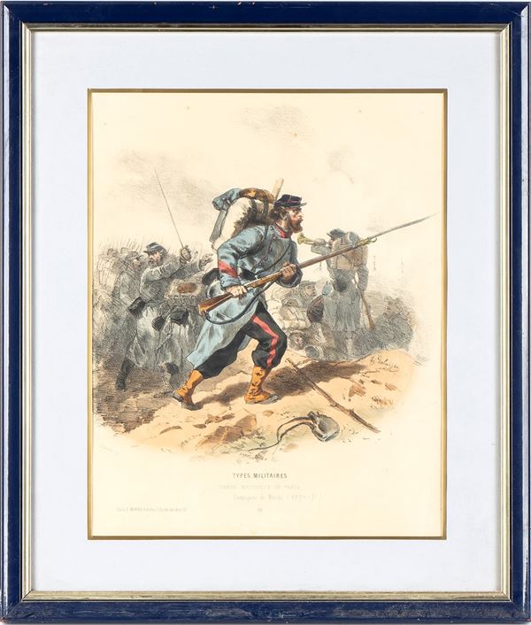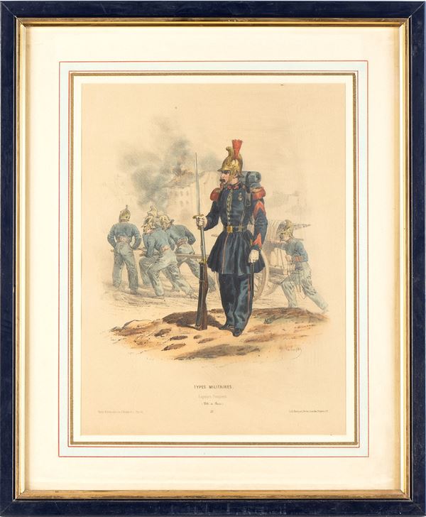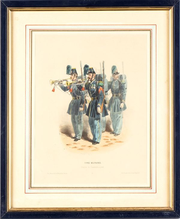 Lot of three lithographs depicting various military types..., Militaria...