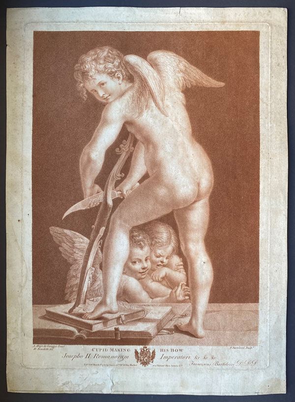 A. Cupid making his bow, after Parmigianino's painting after Correggio. Etching and stipple, 425 x 310 mm (sheet). Fine impression in ink red on laid paper. Sheet in very good condition except for a tear and some peeling on the lower margin. Some creases.