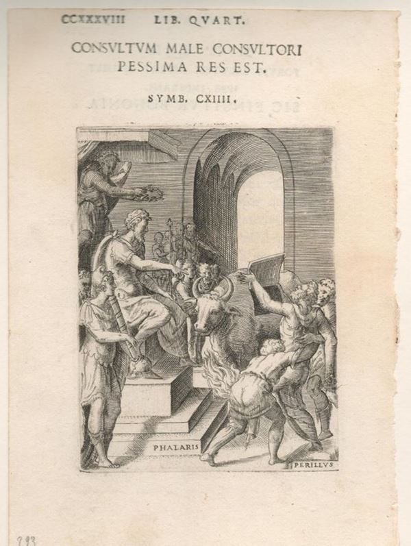 engraving, 110 x 80 mm (plate); 173 x 122 mm (sheet); from Achillis Bocchii Bonon. symbolicarum quaestionum..., fine and well-inked impression, glued along the upper margin on a support, with passepartout