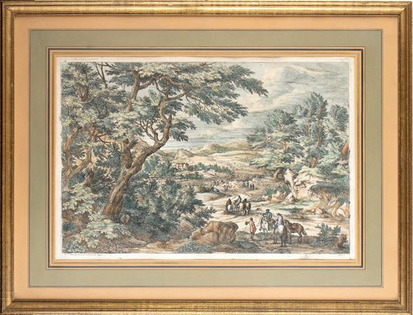 etching, 32 x 46 cm (plate). Impression with nice coeval coloring. With passepartout, glass and frame (50 x 67 x 2 cm). The print has not been examined out of frame.