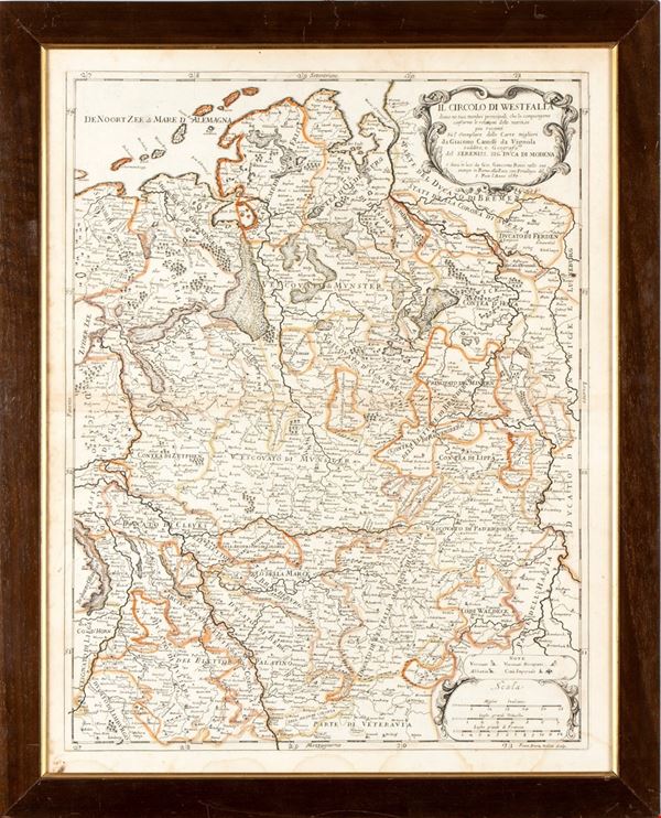 engraving, 60 x 46.5 cm, map of Westphalia, a territory in northern Germany, published by Giovanni Giacomo Rossi in Rome in 1687. Fine, well-inked impression on laid paper, with colored edges, traces of the usual central fold, some slight stain at the bottom. The print has not been examined out of frame (69 x 54 x 2 cm)