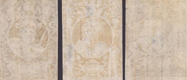 lot of 3 engravings from the series of 12 depicting the heads of the rulers in ornamental borders. Engraving, approx. 124 x 92 mm New Hollstein 266, 268, 270. I state, published by Assuerus van Londerseel. Very fine impressions on thin laid paper (one with watermark). Trimmed specimens. In good condition except for some thinning.