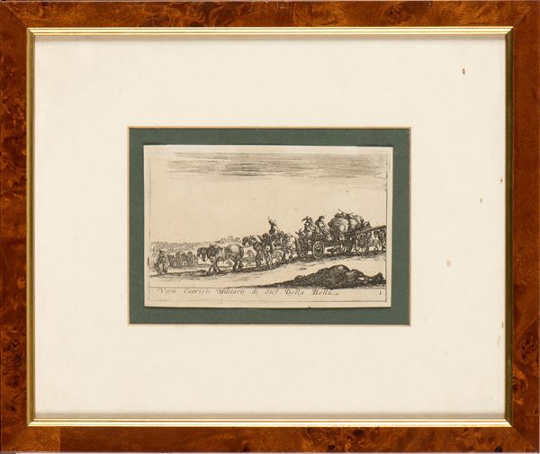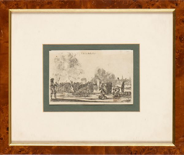 lot of two etchings, 94 x 145 mm ca. Printed on laid paper, trimmed, with small margins. Sheets with oxidation. Framed (have not been examined outside of frames (22 x 26 x 2 mm).