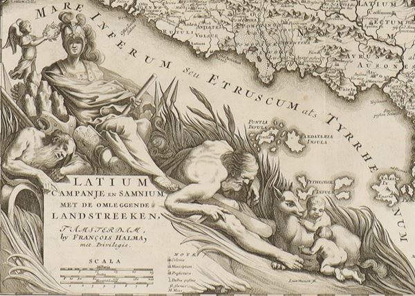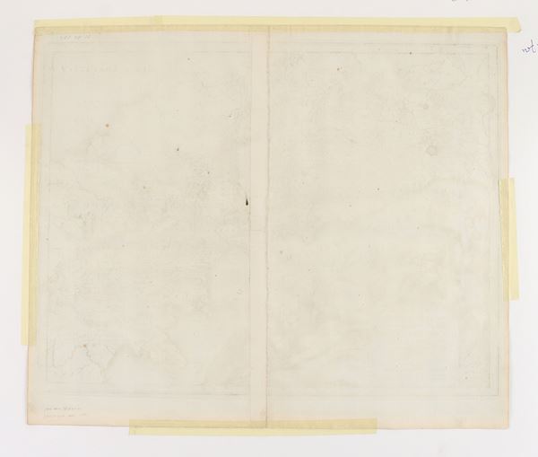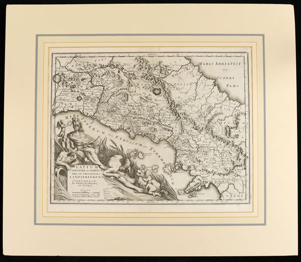 engraving and etching, 345 x 345 mm (plate); 387 x 464 mm (sheet). Map of central Italy. Sharp impression on laid paper, trace of the usual central fold. Two small holes. Fixed on a modern passe-partout.