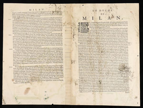 engraving and etching, 405 x 545 mm. Map of the Duchy of Milan taken from "Nouveau Theater du Monde ou Nouvel Atlas". Text in French on the reverse. Fine impression on two joined sheets of laid paper. Usual reinforced central fold on the reverse. Some stains and some small holes. Coeval coloring. Overall in good condition.