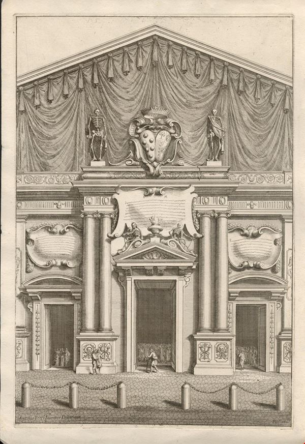 7. Antonio Maria Ferri (1651-1716); Bartoli Pietro Sante Detto Sante Santi (1635-1700) VIEW OF THE FACADE OF THE CHURCH OF SAN LORENZO WITH FUNERAL APPARATUS Etching, 40 x 27 cm