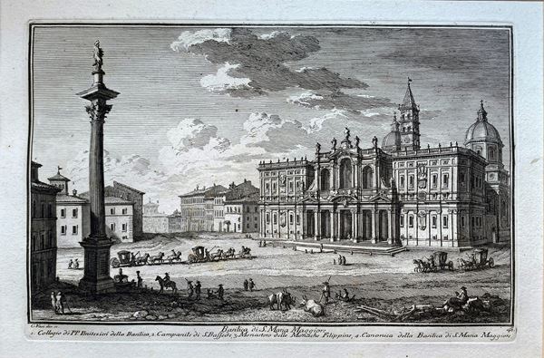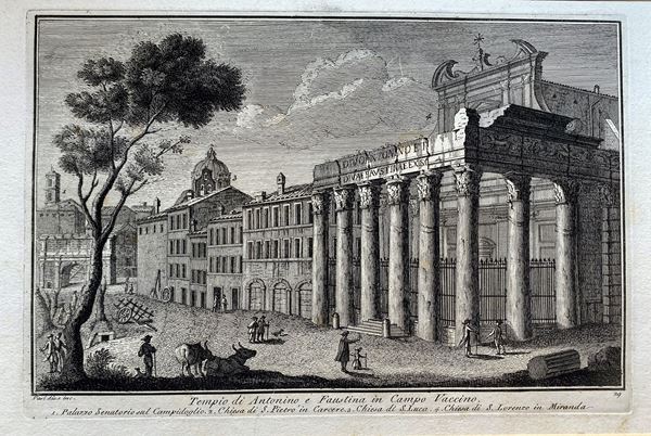 Giuseppe Vasi (1710 โ 1782), Basilica of D. Maria Maggiore | Temple of Anthony and Faustina in Campo Vaccine. Nice impressions in a late edition on heavy laid paper. Very good condition, with passe-partout.