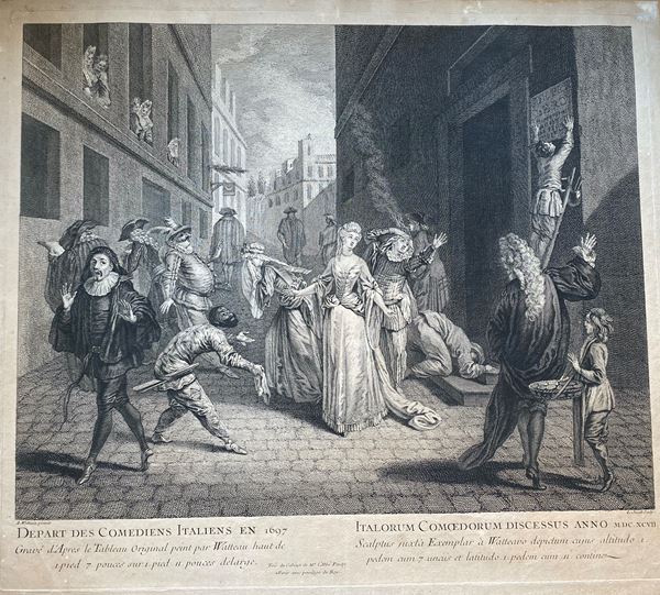 Louis Jacob (1712 - 1802) from Watteau, The departure from Paris of the Italian comedians in 1697. Burin, 41 x 46 cm. Oxidized paper, with some stains. Glued along the upper edge on support.