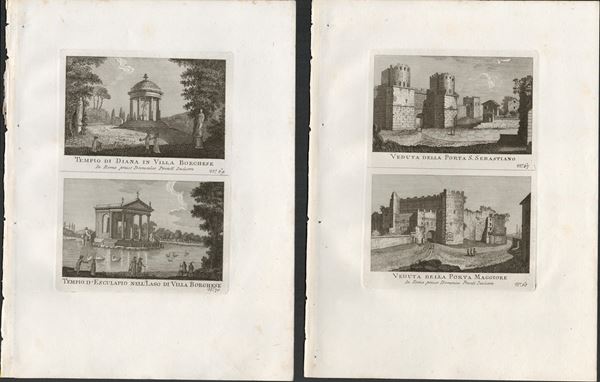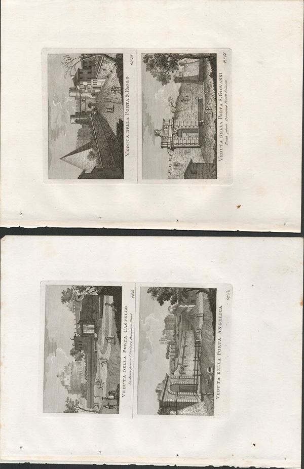 Engraving, 16,5 x 12 cm (platemark); 26,8 x 20 cm (sheet). Lot of 6 plates with views of Rome from "Nuova raccolta delle vedute moderne della città di Roma", 1795.