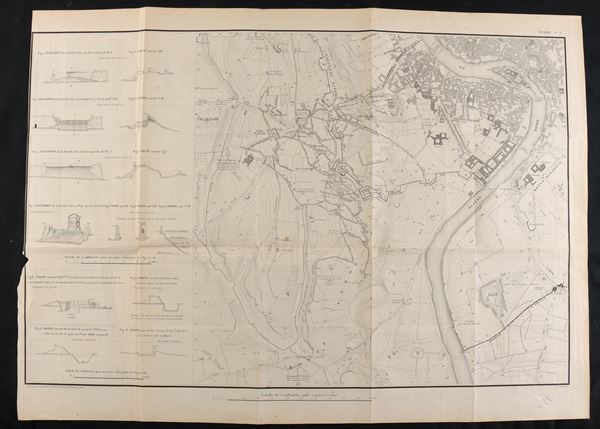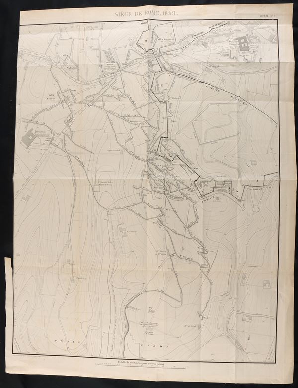 two sheets, lithograph, 58 x 90 cm and 84 x 64.5 cm. Interesting maps depicting the parts of Rome east of the Tiber (Trastevere and Monteverde) in 1849. Sheets in good condition with slight oxidation and vertical and horizontal folds.
