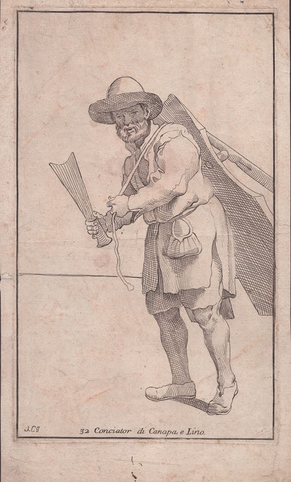 Included: "Tanner of Hemp, and Linen" by Simon Guillain (after Annibale Carracci), etching, 310 x 185 mm (sheet). Printed on laid paper with watermark. Sheet in good condition except for a central fold.