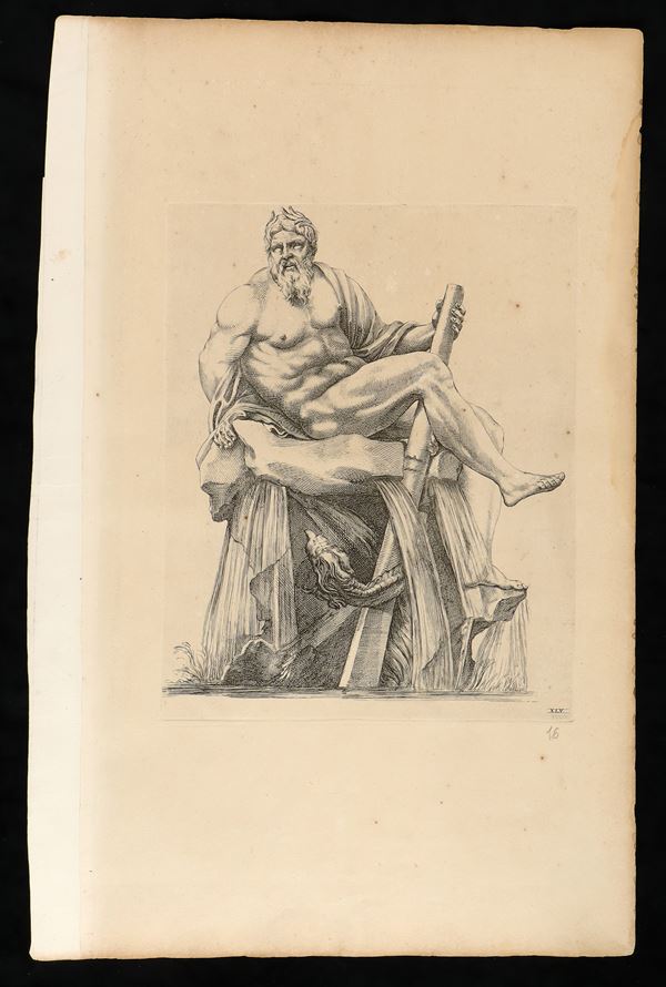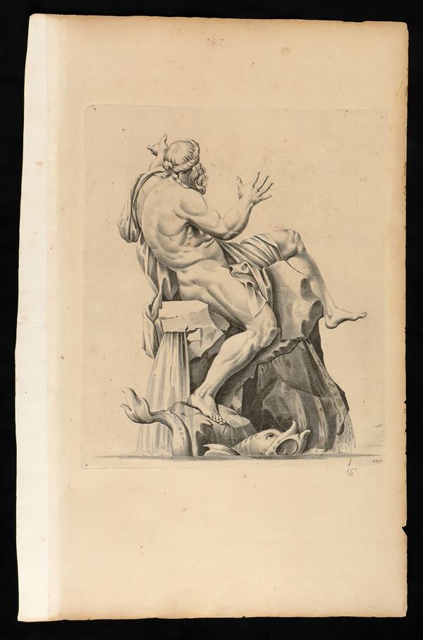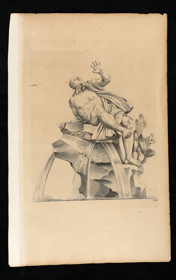 3 engravings depicting the sculptures of the Fountain of the Four Rivers in Piazza Navona, Rome. Engraving and etching, 535 x 345 mm (sheet). Printed on laid paper. Sheets uniformly browned, with small spots. In good general condition.