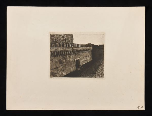 etching and aquatint, 35 x 50 cm (sheet), 21 x 27 cm (plate). Signed in pencil on the bottom right: U. Prencipe, on the bottom left: Il Bastione 11/50 Etching and aquatint on ivory paper, printed with bistro-colored ink. Sheet in very good condition with large margins.