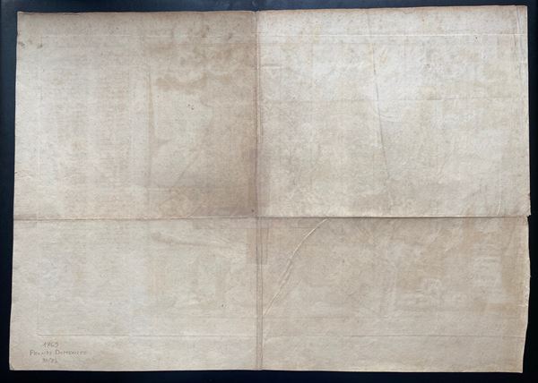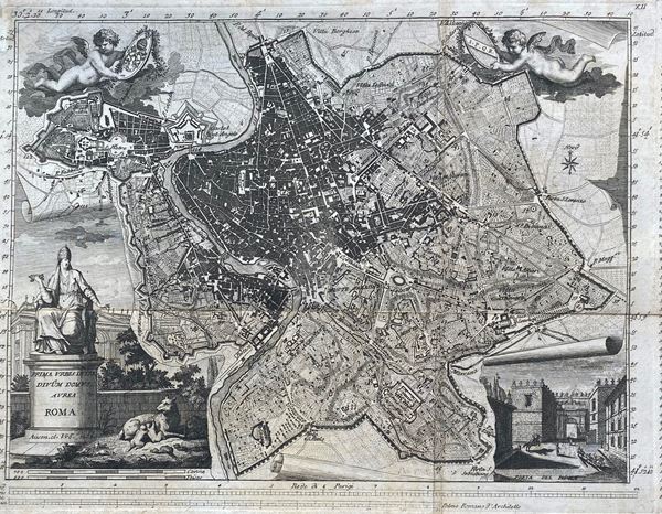 acquaforte, 312 x 445 mm. Riduzione di una famosa pianta di Roma di Noli, con indice. Bella impressione su carta vergata. Un piega verticale e una orizzontale. Usure lungo le pieghe. Leggera fioritura. Margine sinistro mancante 8anche una millimetrica mancanza della parte impressa della lastra in basso a sinistra).