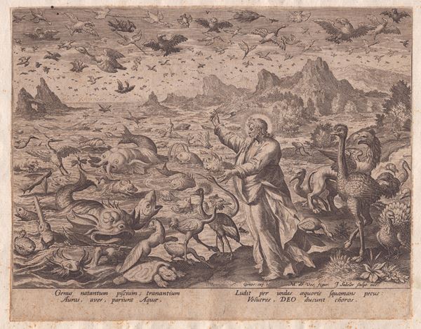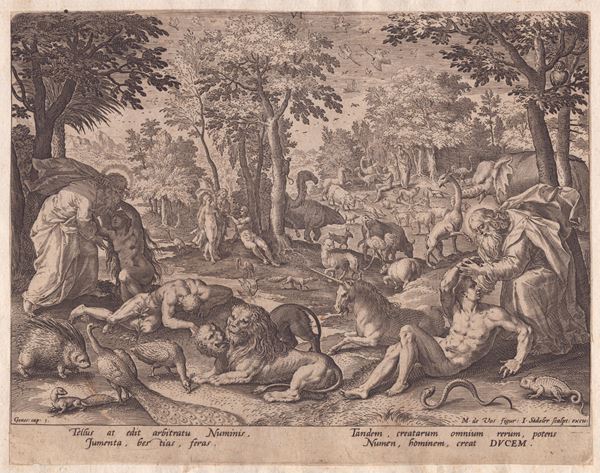 lot of two engravings from the series of seven, by Martin Vos. approx. 200 x 255 mm each. Hollstein 16 and 17. Fine impressions, trimmed and backed.