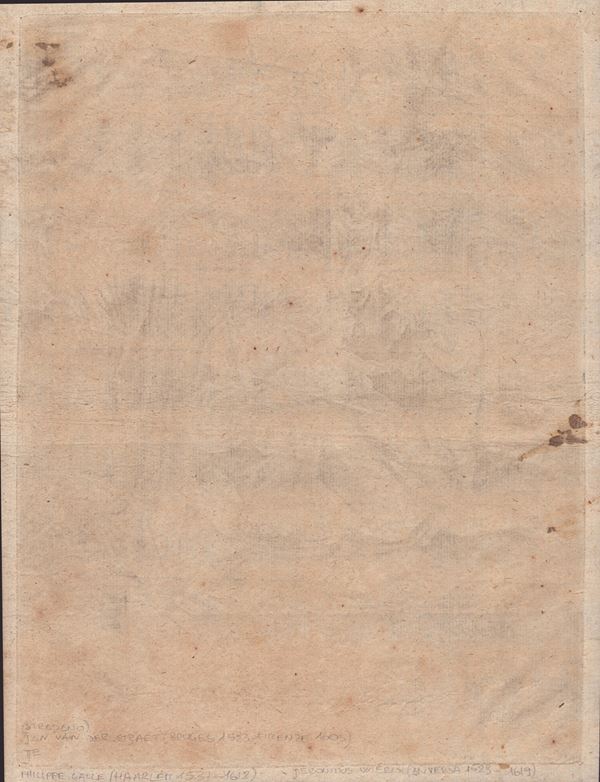 after Jan van der Straet, published by Philips Galle. Burin, 243 x 183 mm (plate), 255 x 196 mm (sheet). Hollstein 757, New Hollstein 154. I state. Splendid proof, very sharp and uniformly inked, on thin laid paper with watermark. Complete sheet, with small margins of approximately 5-7 mm.