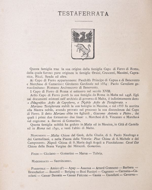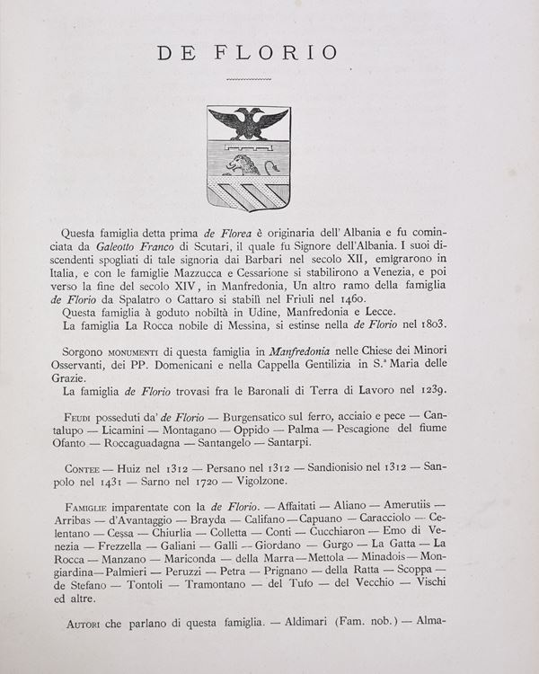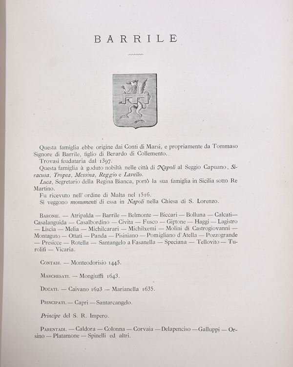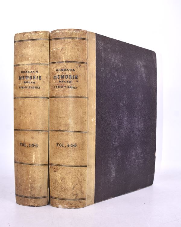 Complete work in 6 parts bound in two volumes in 4°(325x245 mm.) Contemporary half vellumt, titles in black on the spine, pp. IV-236+IV-241+IV-248IV-260+IV-231+IV-245. Dozens of coats of arms engraved in black n.t. with list of families mentioned in the volumes. Good state of preservation. Corner with restoration of a page of the first volume, rare and slight foxing and normal signs of aging.