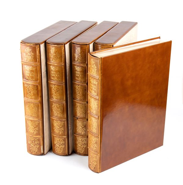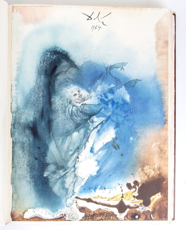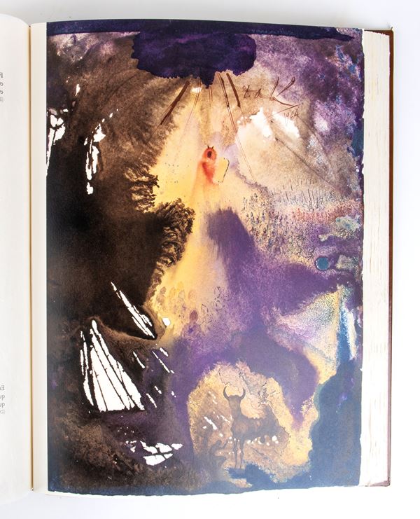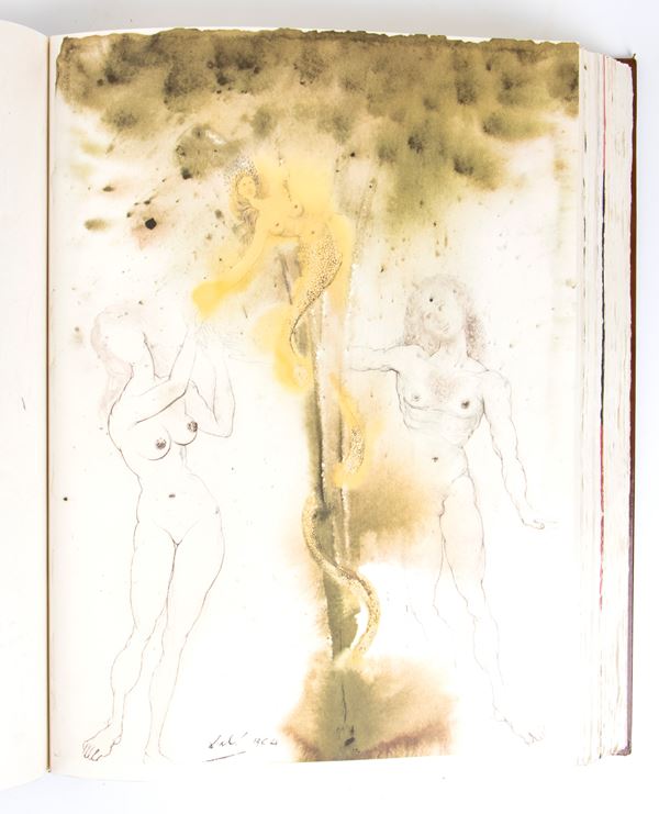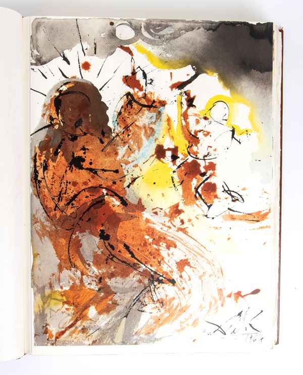 Work in five folio volumes (490x360 mm). Pages 380, [14], [2] blank; 362, [18], [2] white; 346, [22], [6] white; 449, [14], [3] white; 435, [20], [3] white. With a total of 105 beautiful illustrations from the watercolors of Salvador Dalì. The plates, printed with a mixed silk-screen and color lithographic technique, are protected by didactic tissue paper in Japon paper. Marginous specimen, perfectly preserved in its beards. Beautiful binding in full tan leather, richly decorated with phytomorphic friezes and titles embossed in gold on the spine with 5 bands. Golden upper cuts and ivory silk moiré borders. In elegant half-leather cases, with ivory silk moiré plates and spine, well preserved. Copy no. 533 of a total edition of 1797, one of 1499 printed on laid paper. Complete with its case (abrasions to the nerves and cases and small stains on the spines)