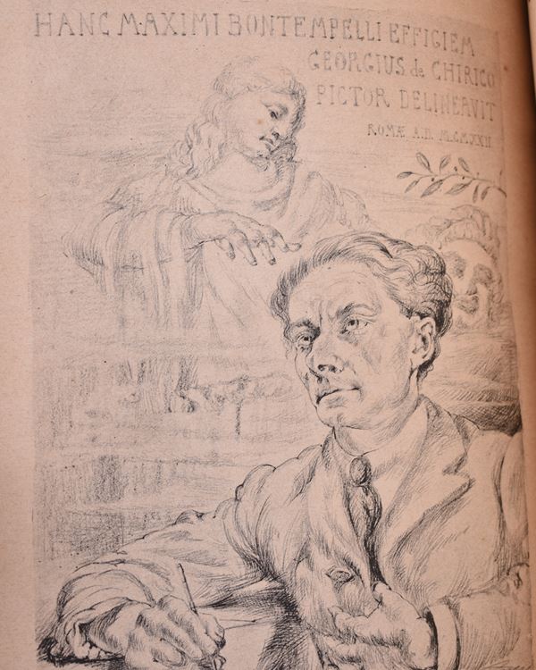 Prima edizione (per l’esattezza si tratta di una delle copie residue del 1922, ricopertinata e rimessa in commercio da Alberto Stock). Tiratura numerata, es. n. 329/444. Con 11 illustrazioni di Giorgio De Chirico riprodotte in fototipia e uno spartito musicale in appendice. Volume con testo intonso, con mancanze al dorso.