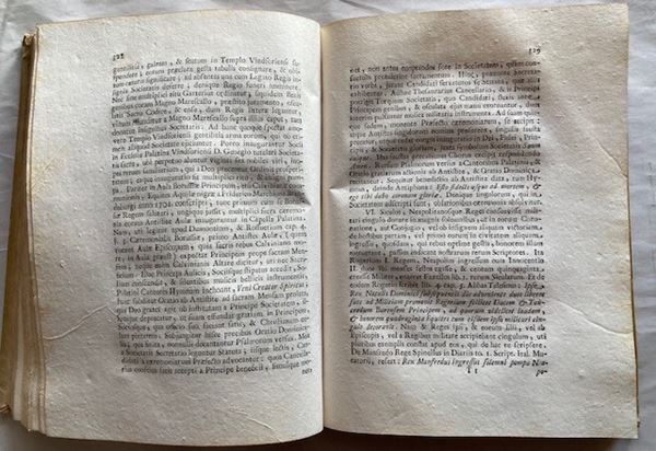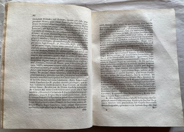 First edition of an important and rare work. This is an interesting treatise dedicated to the prerogatives and privileges regarding the chapels and the palatine clergy in the Kingdom of the Two Sicilies. The Palatine Chapel is located in the Royal Palace of Palermo, also known as the "Palace of the Normans", being a masterpiece of the period of Norman domination. The Author then describes the building, the foundation, the clergy, the privileges, the rites and liturgies of the Royal Palatine Chapel, as well as the honors that some princes receive in the church by pontifical concession. (Mira I, 174; Narbone I, 285; Dura, 2864; Lozzi, 5018 cites the 1772 edition).