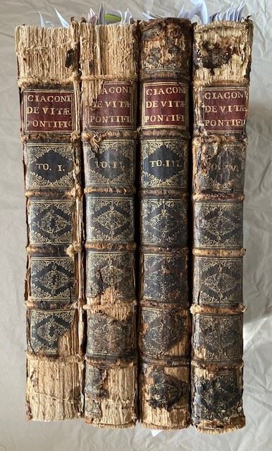 CIACCONIO (Chacón), Alfonso <1540-1599> - Vitae, et res gestae pontificum Romanorum et s.r.e. cardinalium ab initio nascentis Ecclesiæ vsque ad Clementem IX. p.o.m. Alphonsi Ciaconii Ordinis Praedicatorum & aliorum opera descriptæ: cum vberrimis notis. Ab Augustino Oldoino Societatis Iesu recognitæ, & ad quatuor tomos ingenti vbique rerum accessione productæ. Additis pontificum recentiorum imaginibus, & cardinalium insignibus, plurimisque æneis figuris, cum indicibus locupletissimis. Tomus primus [-quartus]. Romæ : cura, et sumptib. Philippi, et Ant. de Rubeis, 1677.