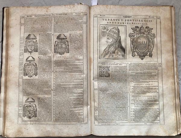 Folio (41.5x27 cm), 4 big and thick volumes in contemporary brown calf, gilt spines with titles in gold on red calf labels (quite worn at corners and head/foot of spines with calf losses), internally in parts more or less browned for own quality of the paper, several leaves or quires loose or partially disbound . Titles in red and black, each with half-page engraving, almost 2.000 woodcuts in the text depicting portraits of popes and Cardinals, and their coat-of--arms, but also seals, couins, medals, and almost 50 engraved plates. Hundreds of pages, item not collated, sold as is, LOT NOT SUBJECT TO RETURN.