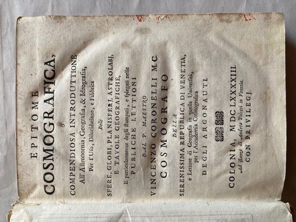 CORONELLI, VINCENZO MARIA. Epitome cosmografica o Compendiosa introduttione all'astronomia, geografia, e idrografia, per l'uso, dilucidatione, e fabbrica delle sfere, globi, planisferj, astrolabj, e tavole geografiche. Cologne (but Venice), Andrea Poletti, 1693.