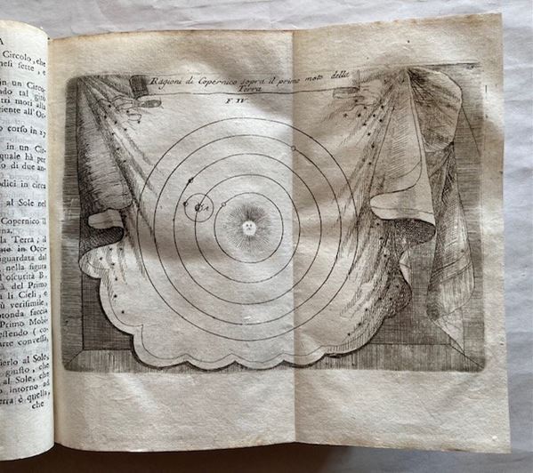 8vo (185 x 130 mm), contemporary vellum with manuscript title on spine, red sprinkled edges, internally a clean copy, in good condition; an early ownership entry cancelled by pen on flyleaf and pastedown. Engraved frontispiece, printed title, pp. (30 incl. front.), 420, (16 nn.), textually complete but with only 29 engraved plates (of 38, only 1 celestial chart is present, the “Emisfero settentrionale”), plates mostly double-page, (brown spot at gutter of pp. 359/362, which have shorter margins as from another copy; the celestial chart a bit defective, with small tears and repairs).