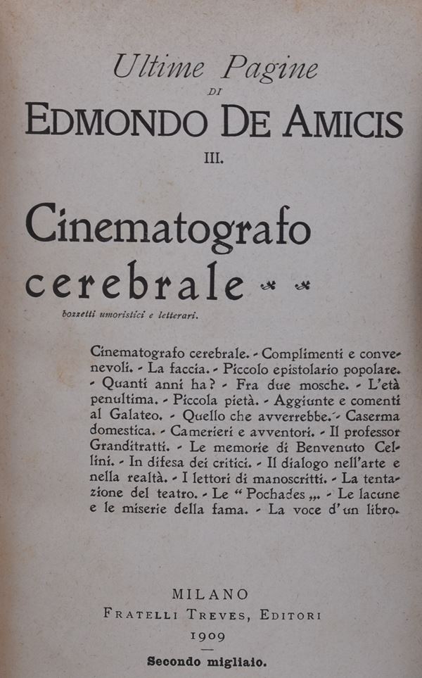 Prima edizione, 2Β° migliaio. Collezione Ultime Pagine di Edmondo De Amicis, vol. III. Legatura post. in mezza pelle con dorso fregiato, risguardi in carta decorata.