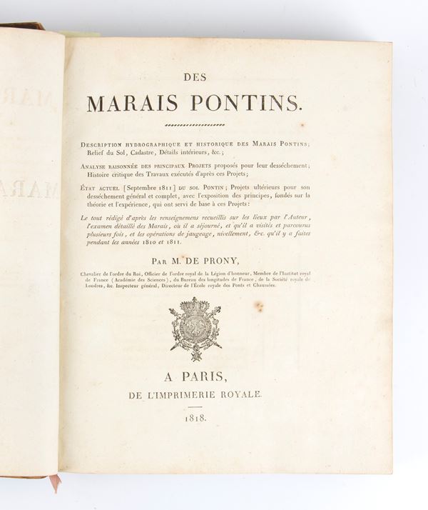 DE PRONY. DESCRIPTION HYDROGRAPHIQUE ET HISTORIQUE DES MARAIS PONTINS. Paris 1818-1823