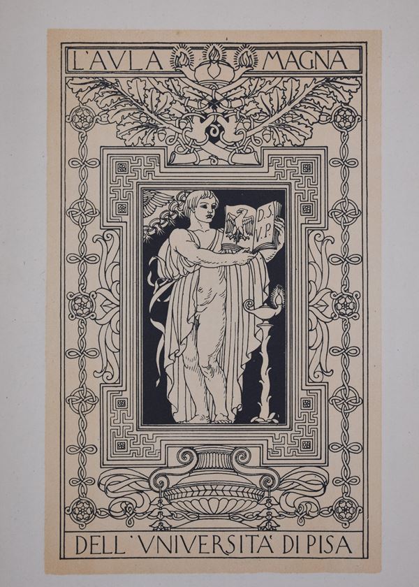 Edizione fuori commercio, tiratura di 100 esemplari numerati (ns. es. n. 11). Con dedica autografa dell'A. Splendido esemplare della pubblicazione celebrativa dell'ateneo pisano, opera magistralmente illustrata con gli affreschi di Adolfo De Carolis.