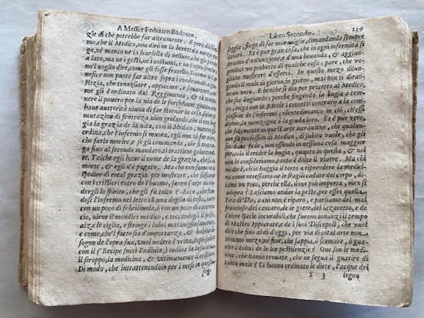 8vo (the leaf 143x95 mm), contemporary ‘carta rustica’ venetian pasteboard, spine lately covered with colored paper, flyleaves with fragments of a leaf perhaps from a 17th cent. edition of Della Porta’s work on Physiognomy, generally a genuine copy (6 leaves still unopened). Small woodcut device on title-page, pp. [6], 256 [i.e. 258, the first numb. leaf wrongly numb. 5 as quoted by the Italian SBN].
