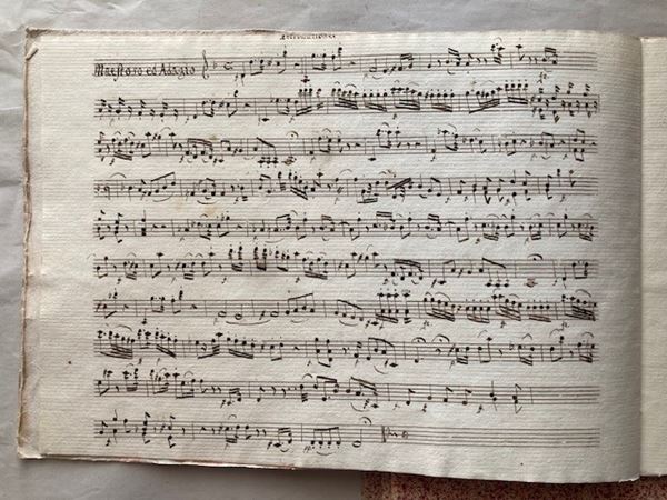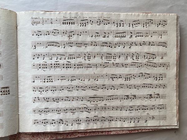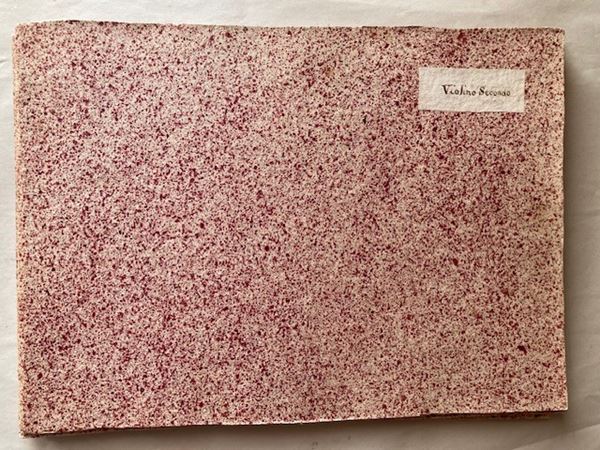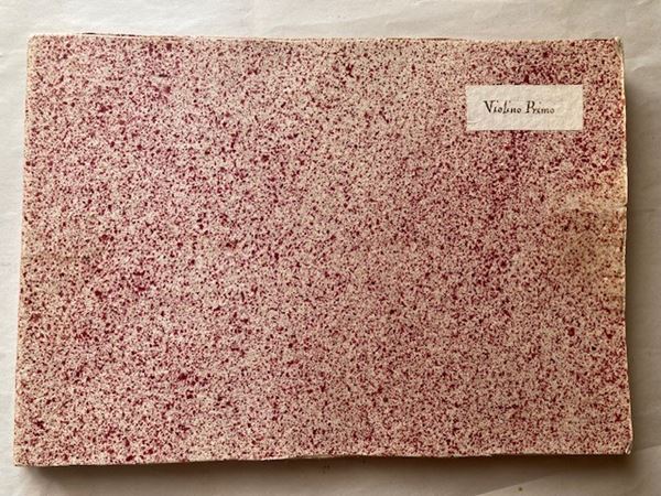 Musical manuscripts on paper; oblong 4to (215x305 mm); ff. [6], [6], [6], [6]; four gatherings in the original boards covered with pink “mouchetè” paper, very genuine with fitting paper labels on each album (Violino primo, etc, one label missing); preserved into the original pasteboard slipcase, covered with similar paper (colored in green); all the albums in fine condition.
