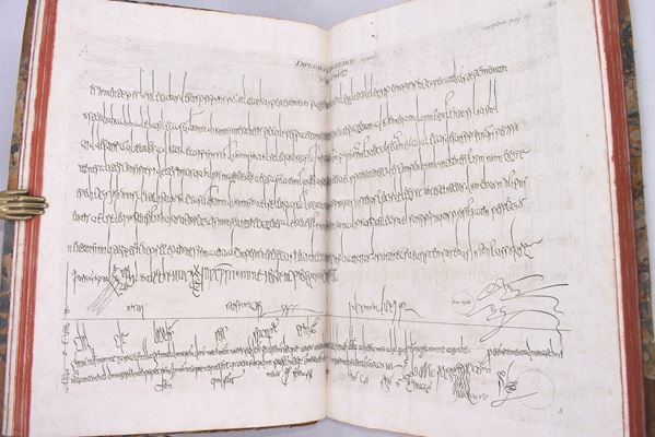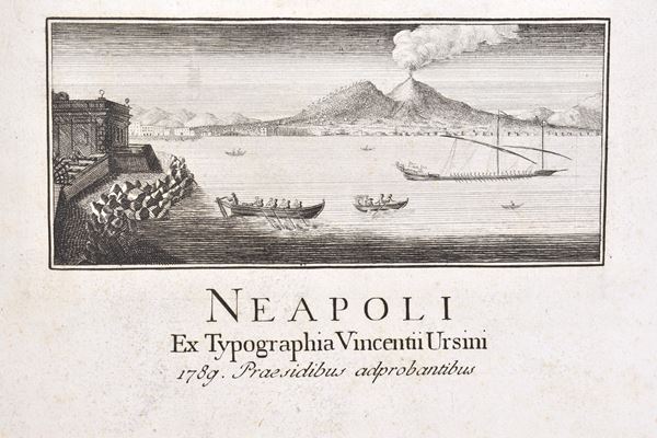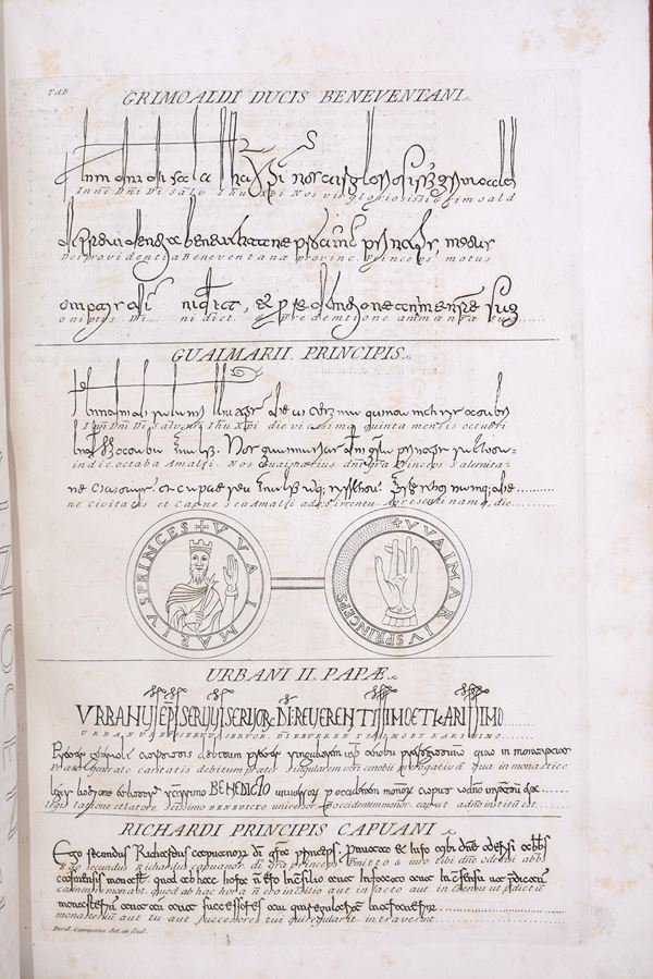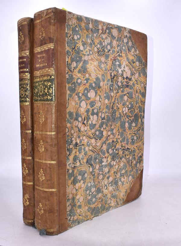 Rare third and new edition with over 60 finely engraved plates mainly on double pages, xil frontispiece. (A. Zaballi scul.), refined cartoons calc. on the title pages and numerous engravings in the text. Includes the appendices “De re diplomatica librorum supplementum in quo archetypa in his libris …” in the second volume. The binding for both volumes is contemporary in half calf, with a gold-decorated spine and col.
