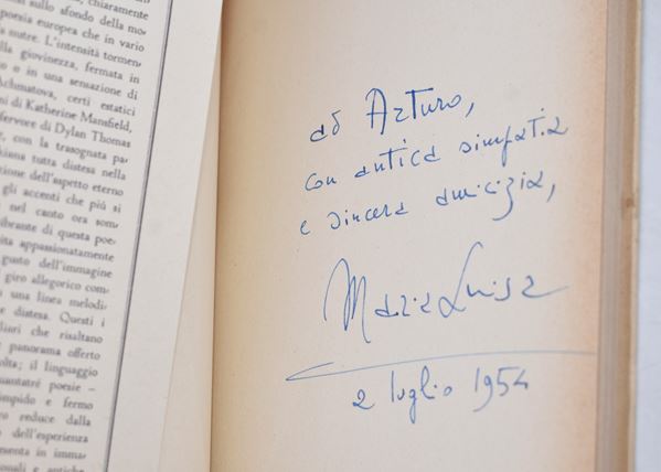 Prima edizione dell'opera prima della Spaziani, collezione Poeti allo Specchio. Esemplare con dedica autografa rilasciata dall'autrice allo scrittore Arturo Tofanelli il 2 Luglio 1954.