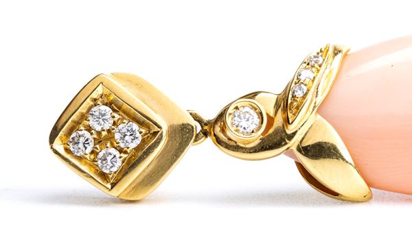 18K yellow gold, each with pear drop cerasuolo coral (corallium elatius) surmounted by diamonds.