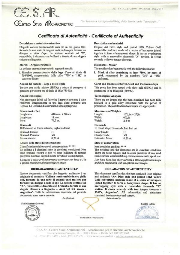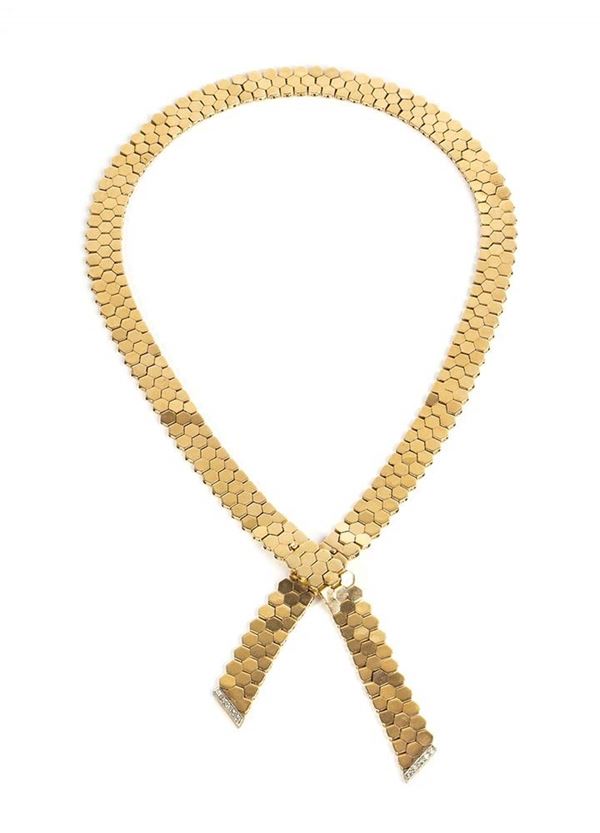 18K yellow gold convertible necklace made of a series of hexagons joined together to form a honeycomb shape. It has an overlapping style with a removable "X" section with 10 round shape huit huit cut diamonds,0,20 ct approx., color H, clarity VS. It closes securely with two tongue closures. Hallmarked "750" & โ18k".