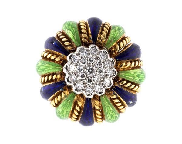 18k yellow gold shaped as a gourd, embellished with twenty-one pavè set diamond and surrounded by blue and green enamels. Round shaped brilliant cut diamond approx. 0.90 ct, G-H, VVS-VS. Hallmarked "18K".